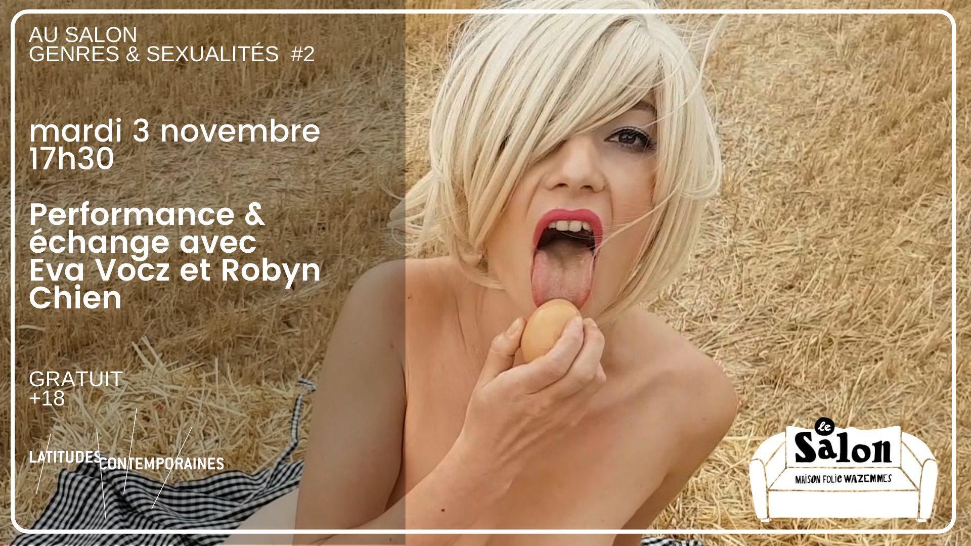 Pour son deuxième temps fort Genres & sexualités au salon, Latitudes Contemporaines s’associe au colloque « Médiatiser les sexualités » organisé par les universités de Lille et Rennes 1, et invite les pornographes et artistes Eva Vocz et Robyn Chien à proposer un écho performatif aux thématiques abordées par ce colloque.