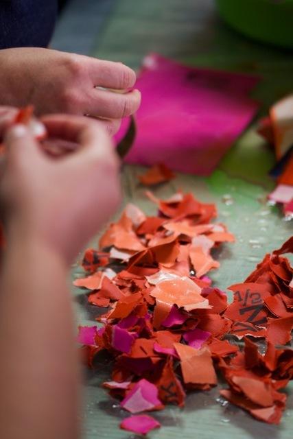 On se familiarise avec le papier recyclé, en fabriquant des cartes à partir de plusieurs couleurs de pâtes à papier.