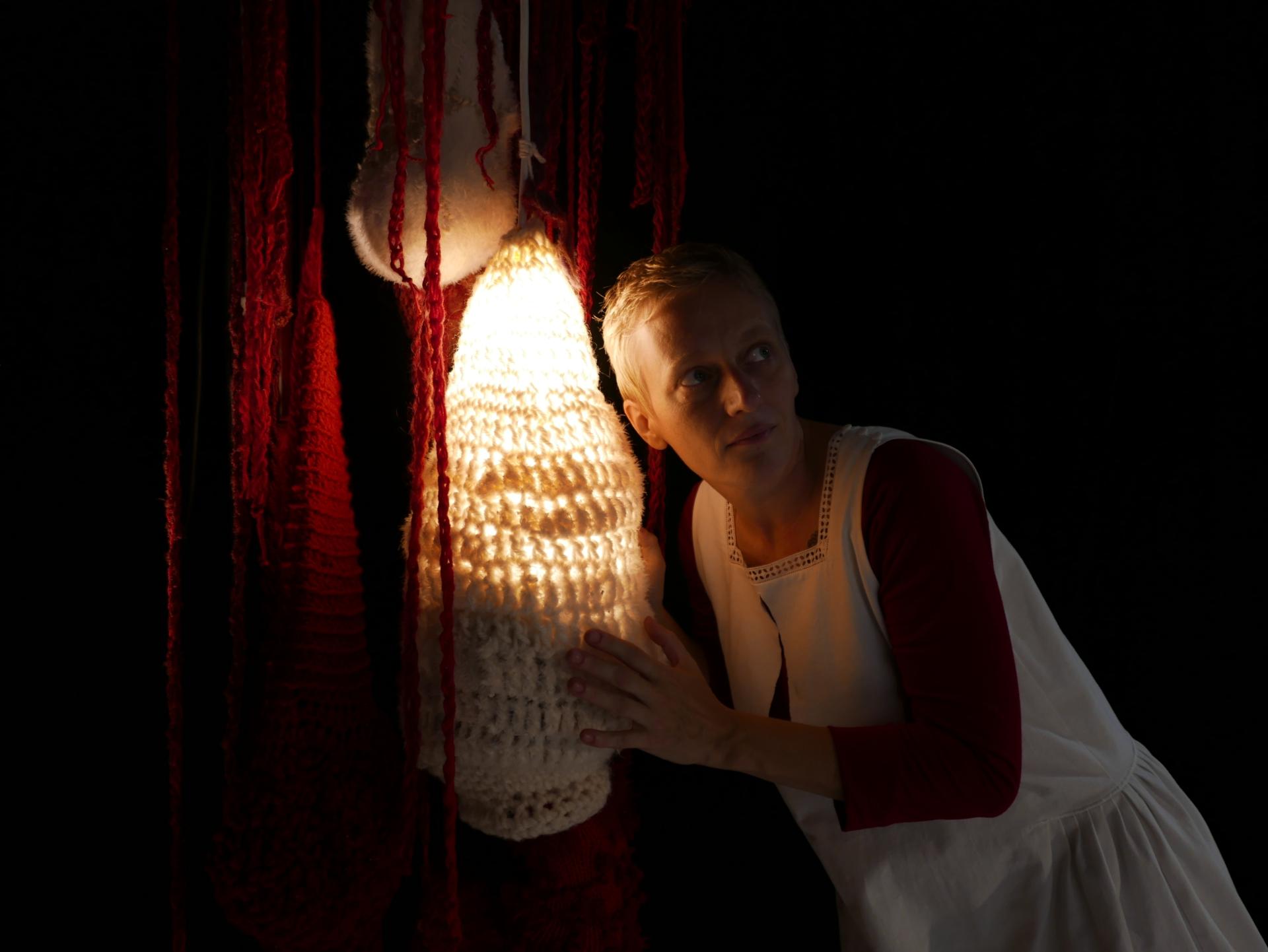 Entrelacs explore les liens qui unissent les êtres en plaçant parents et enfants au cœur d’une sculpture textile faite de fils tendus, tricotés, brodés ou tissés.
