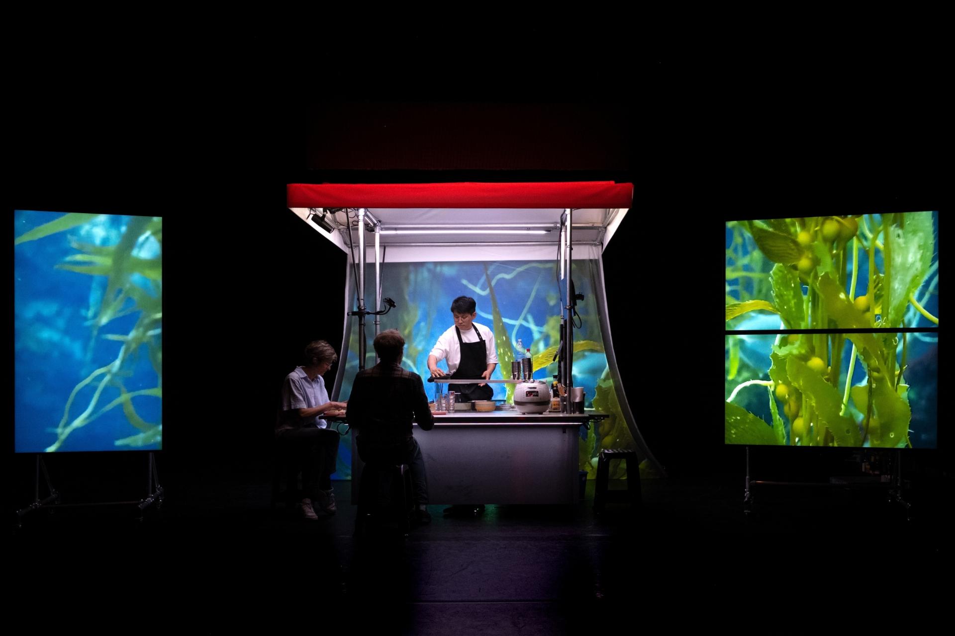 Avec Haribo Kimchi, nous voilà plongé·es dans un pojangmacha, ces cantines de rue typiques de la nuit sud-coréenne. Nous y rencontrons trois personnages : un escargot, un ourson en gélatine et une anguille, qui nous entraînent dans un voyage culinaire où la nourriture devient un refuge pour celles et ceux qui ont été déraciné·es de leur culture. À travers une série d’anecdotes intimes et absurdes, le metteur en scène et compositeur sud-coréen Jaha Koo raconte l’évolution de la culture du kimchi, la douleur brute du racisme, la honte de vouloir se fondre dans la masse et la saveur umami profonde du foyer retrouvé. À travers un langage hybride mêlant musique, création vidéo et interventions robotiques, il interroge les tensions et paradoxes de l’assimilation culturelle.