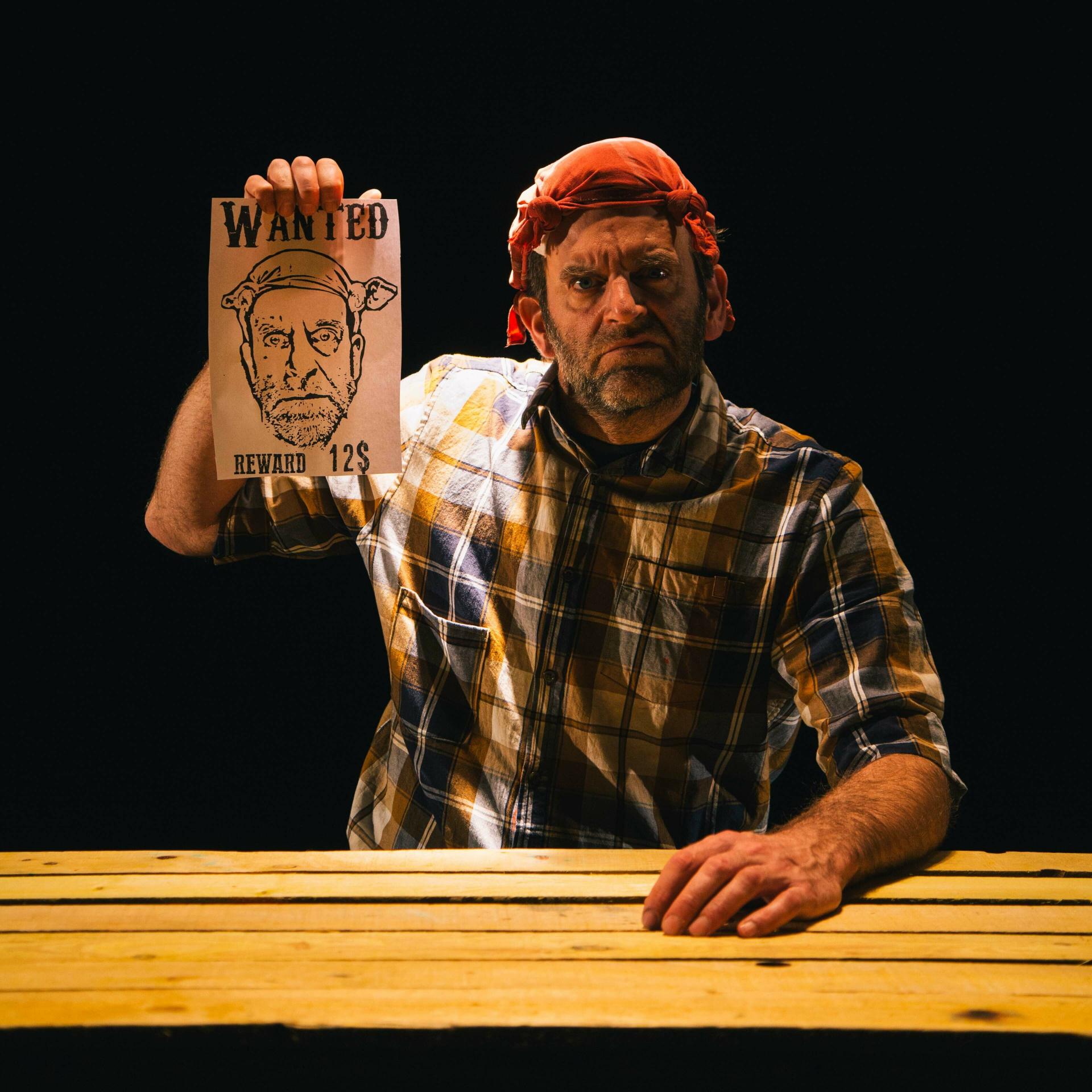 La scène du théâtre est presque nue, violemment éclairée par les projecteurs. Le comédien, seul en scène, fait apparaître les personnages et les obstacles, campe les décors et les situations.