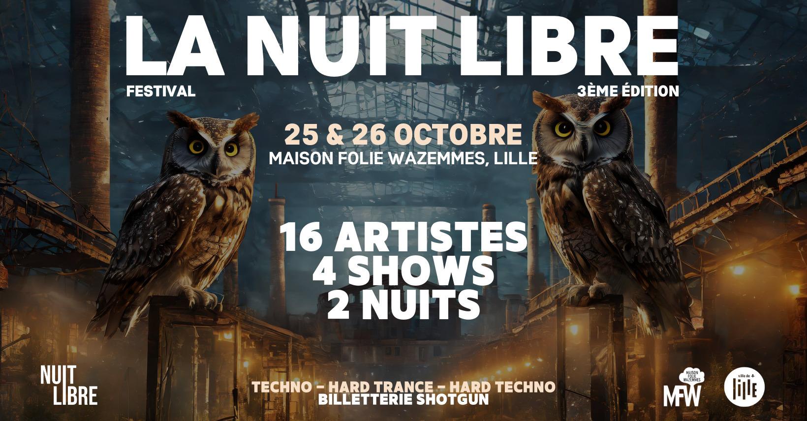Au total ce sont 16 artistes aux styles allant de la trance à la hardtechno qui occuperont la scène durant deux nuits. Pour cette 3ème édition, NUIT LIBRE maintient ses engagements : accessibilité, parité Femmes/Hommes sur scène, soutien à l’émergence artistique.