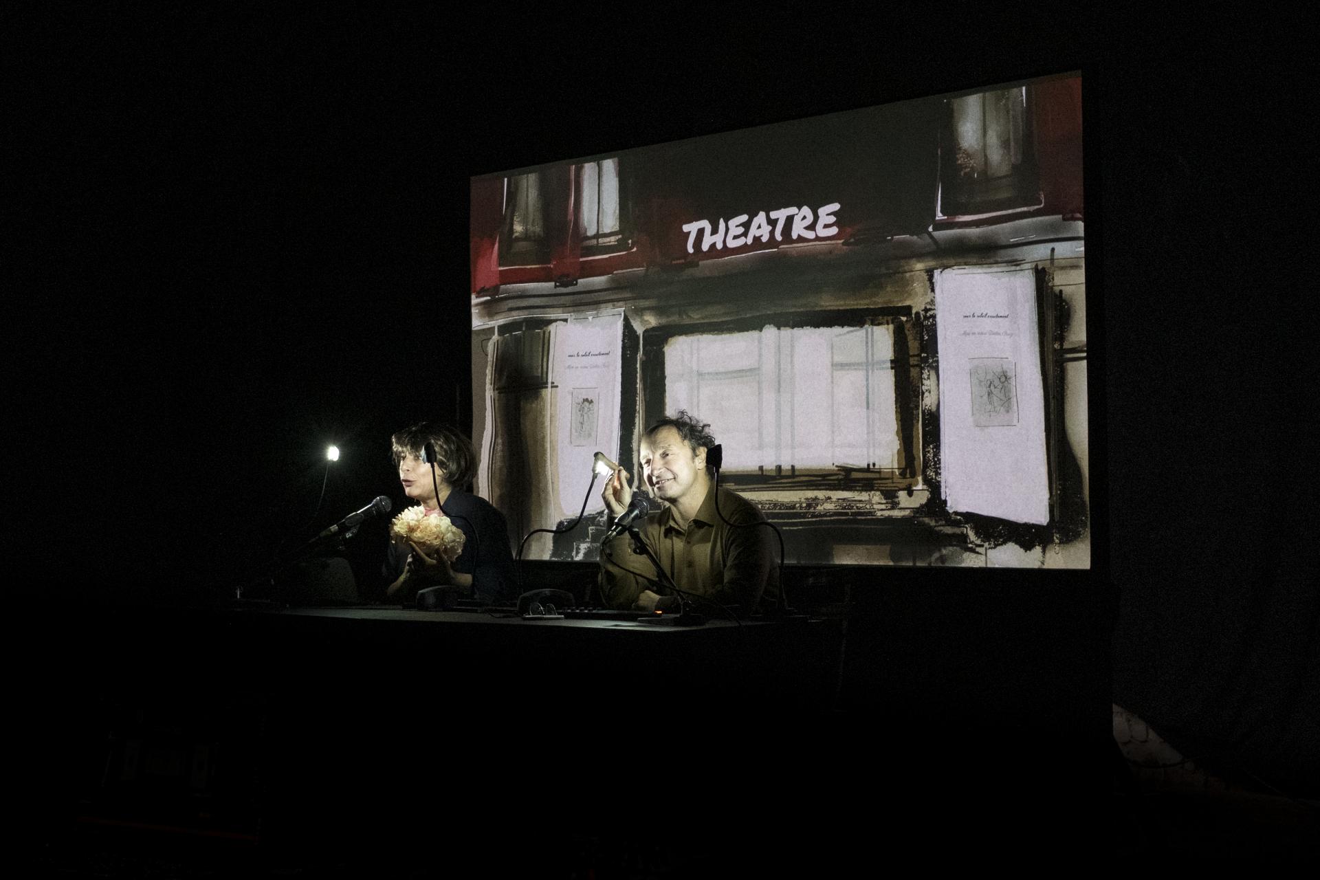 Comédien et comédienne orchestre, un homme et une femme, jouent tous les personnages à l’aide de perruques et autres accessoires – un chapeau, des lunettes… – qui dessinent rapidement un profil. Ils font les bruitages et gèrent en direct la régie son, lumière et vidéo. Derrière eux, un support de projection avec vidéoprojecteur en rétroprojection reçoit les images des décors.